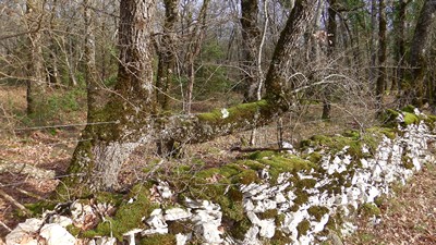 arbre clôture - le tronc est forcé latéralement et protège ainsi le mur en pierres sèches, ancienne pratique dans le causse abandonné actuellement.