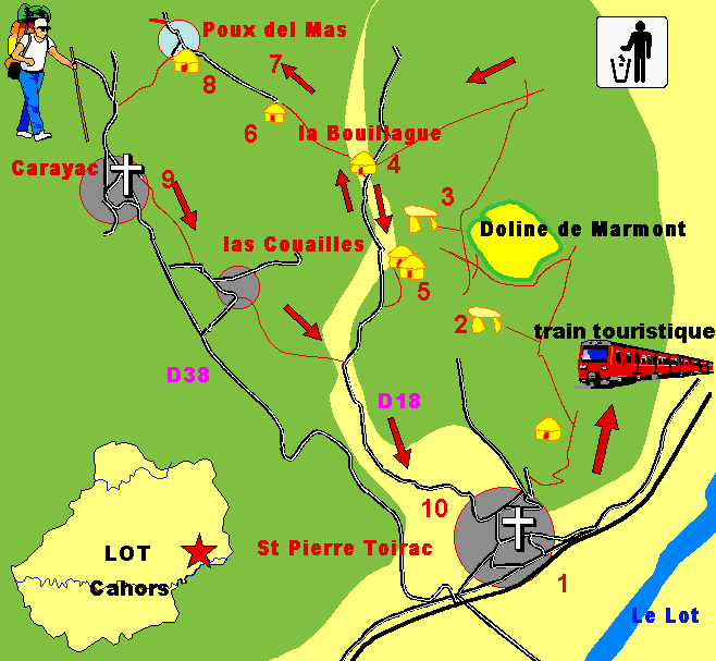 • Prendre la route de Béduer (D18) et tourner à droite au niveau de la poste. Laisser une petite route sur la gauche et à la fourche suivante, continuer tout droit sur la route qui monte. Au croisement suivant, emprunter la route en face qui monte en tournant et permet de profiter d'une jolie vue sur St Pierre Toirac; elle devient un chemin. Suivre celui-ci jusqu'en haut en laissant un chemin sur la gauche à hauteur d'une maison.