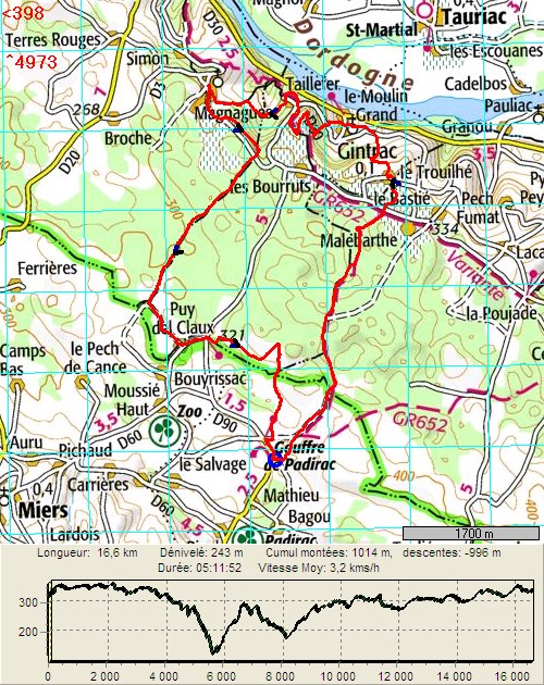 • Au départ du parking du gouffre de Padirac, 9 randonneurs caillacois ont osé braver la pluie fine de ce 29 septembre 2012. Cette petite pluie ne les a pas empêchés de parcourir les 16.5 km de cette boucle. Après le plateau du causse, descente vers la vallée de la Dordogne pour arriver à Gintrac, village aux magnifiques maisons.