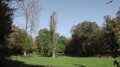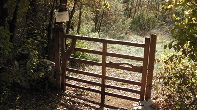 Rando ombragée et bien balisée en jaune. Thème : les puits et les fontaines : les fiches explicatives sur papier imprimé sont décolorées et souvent illisibles.