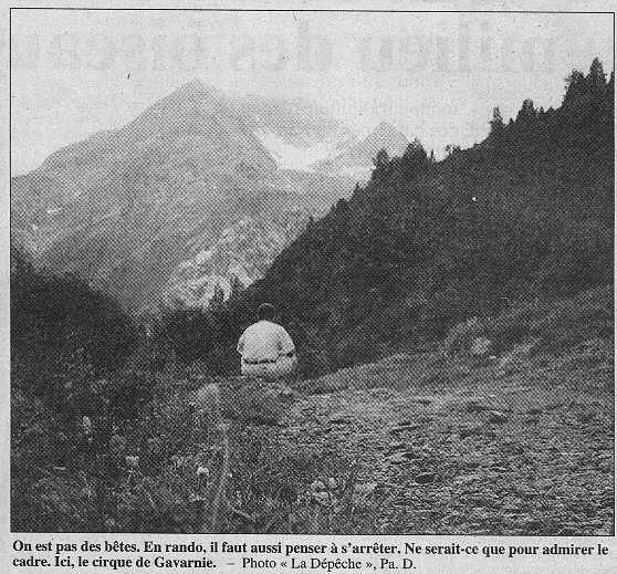 L'équipement.« Dans le sac à dos, vêtements chauds et vêtements de pluie. Aussi, nourriture et boisson. Un petit déj' costaud permet de partir du bon pied. Et il faut boire énormément. Pour une journée de rando, prévoir 1,51 minimum. L'eau ne doit pas être nécessairement minéra1isée. Si on a des crampes, 1a solution miracle est simple : boire. Eviter l' eau des ruisseaux. Surtout s' i1 y a des troupeaux à proximité. Elle peut contenir des parasites. » Pour un bon sac à dos, vous pouvez trouver votre bonheur dans une fourchette de 200 à 400F